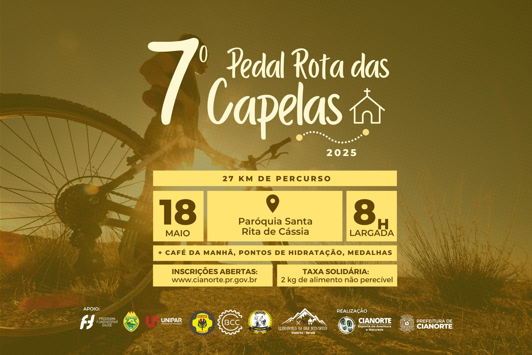 Amantes do Mountain Bike não competitivo já podem se inscrever para a 7ª edição do Pedal Rota das Capelas. A participação é gratuita, mediante taxa solidária, por meio da doação de dois quilos de alimentos não perecíveis, que devem ser entregues no check-in, e serão destinados às ações dos Vicentinos da Paróquia Santa Rita de Cássia. O cadastro deve ser feito por formulário on-line, disponível no site da Prefeitura (www.cianorte.pr.gov.br), banner rotativo, ou diretamente pelo link https://forms.gle/KgUUDVGH4bo3WoRE7. As vagas são limitadas a 500 participantes.