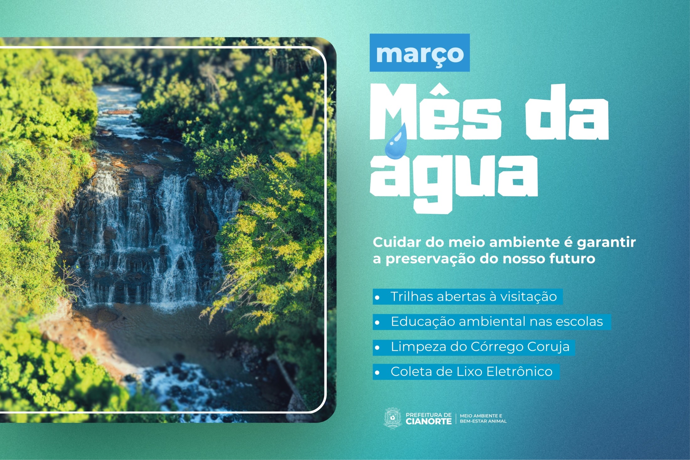 Em Cianorte, no decorrer de março, a Prefeitura realiza uma programação especial em celebração ao Mês da Água, com atividades voltadas à sensibilização ambiental, incentivo ao contato com a natureza e preservação dos recursos hídricos. A agenda inclui as trilhas do Cinturão Verde abertas à visitação, palestras de educação ambiental nas escolas, limpeza do Córrego Coruja e Coleta de Lixo Eletrônico.